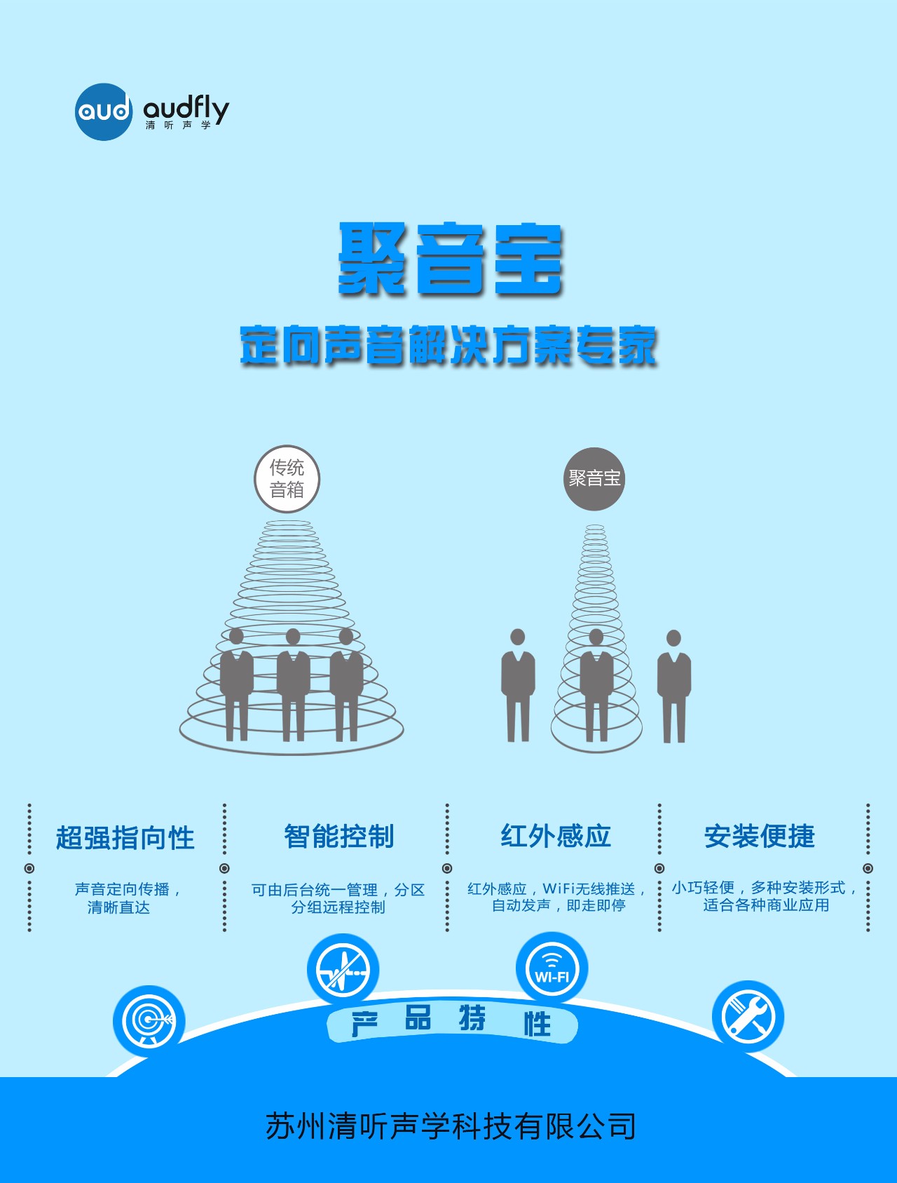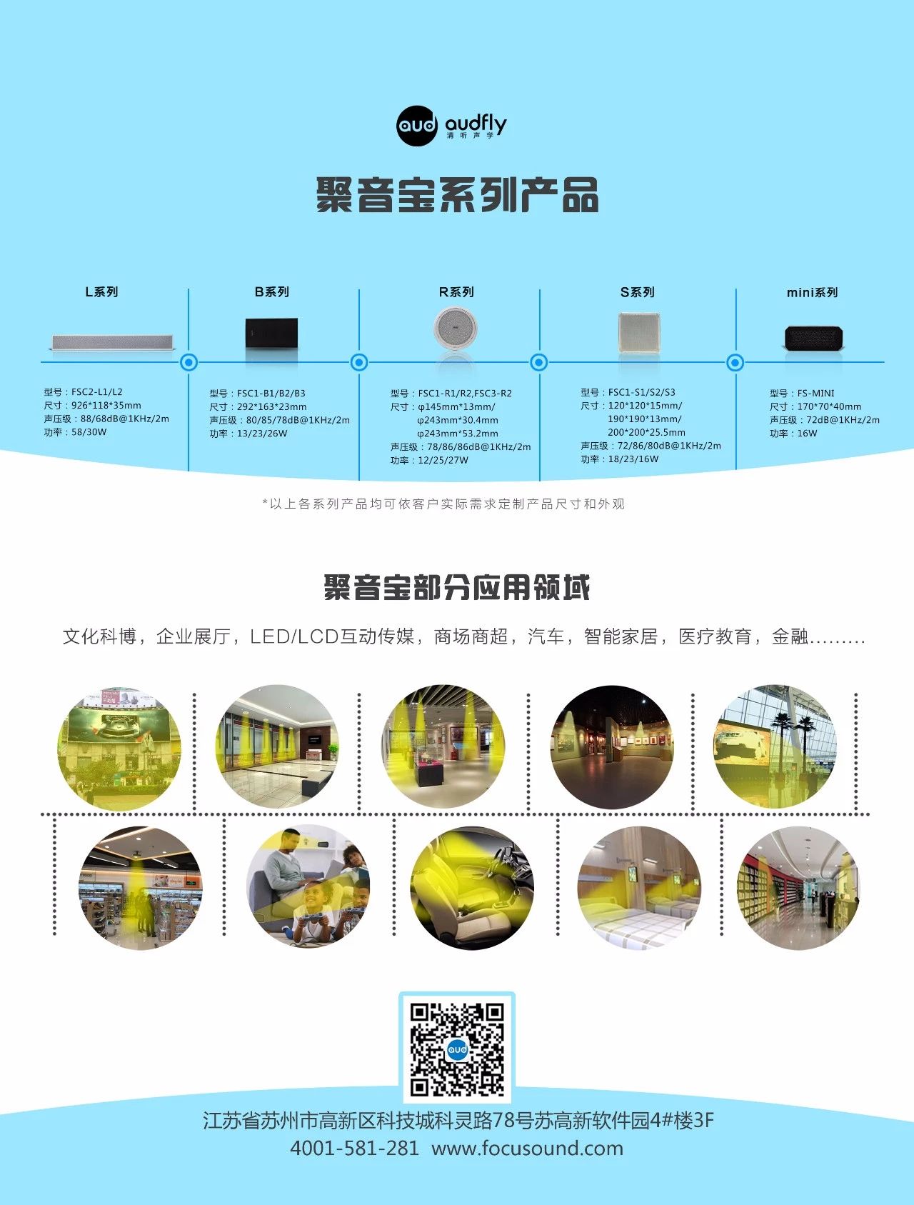 聚音寶是一款融合了定向聲技術(shù)的高科技超指向揚(yáng)聲器,憑借其聲音超強(qiáng)指向性、音源立體定位以及防治噪音產(chǎn)生等特點(diǎn),截至目前,已廣泛應(yīng)用于博物館、展廳等展覽展示工程、LED/LCD音視頻廣告集成、商場超市、銀行、醫(yī)院、汽車等20多個(gè)行業(yè)領(lǐng)域,提供專業(yè)的定向聲解決方案。