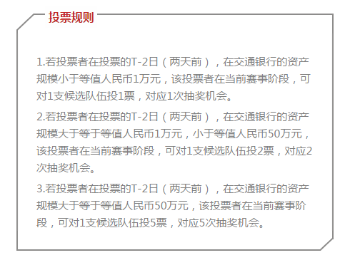 在海選階段,每位客戶只能投一次票,投票完畢后即使資產(chǎn)增加,也不能進(jìn)行補(bǔ)投票,是否要做大權(quán)在握的土豪,投票前要確認(rèn)清楚哦。