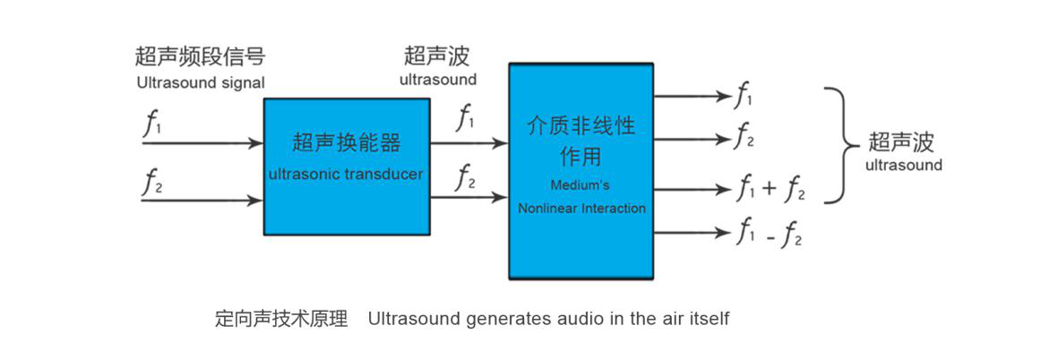 定向音箱是融合了定向聲技術的聲學創新應用產物。基于定向聲技術原理,將低頻聲音信號搭載于指向性很強的高頻信號上,經過放大投射到空氣中,根據聲音在空氣中的傳播特性,高頻信號會被迅速過濾掉,而高頻信號上的可聽聲信號會自然濾出,實現聲音的定向傳播。與此同時,定向聲技術會把聲波控制在特定區域內傳播,在這個區域內的聲波很強,而在這個區域外的聲波會逐漸減弱,甚至不易被人耳識別。